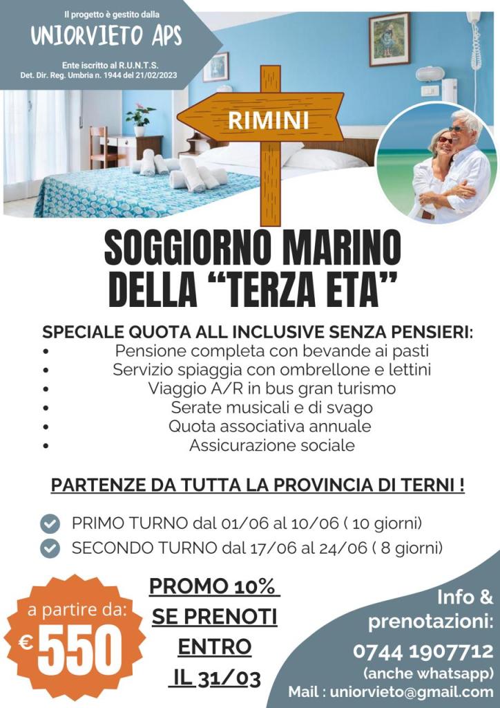 UniOrvieto APS promuove anche per il 2026 il progetto “Soggiorno Marino della Terza Età”, un’iniziativa dedicata a chi desidera trascorrere alcuni giorni al mare in compagnia, relax e sicurezza.
